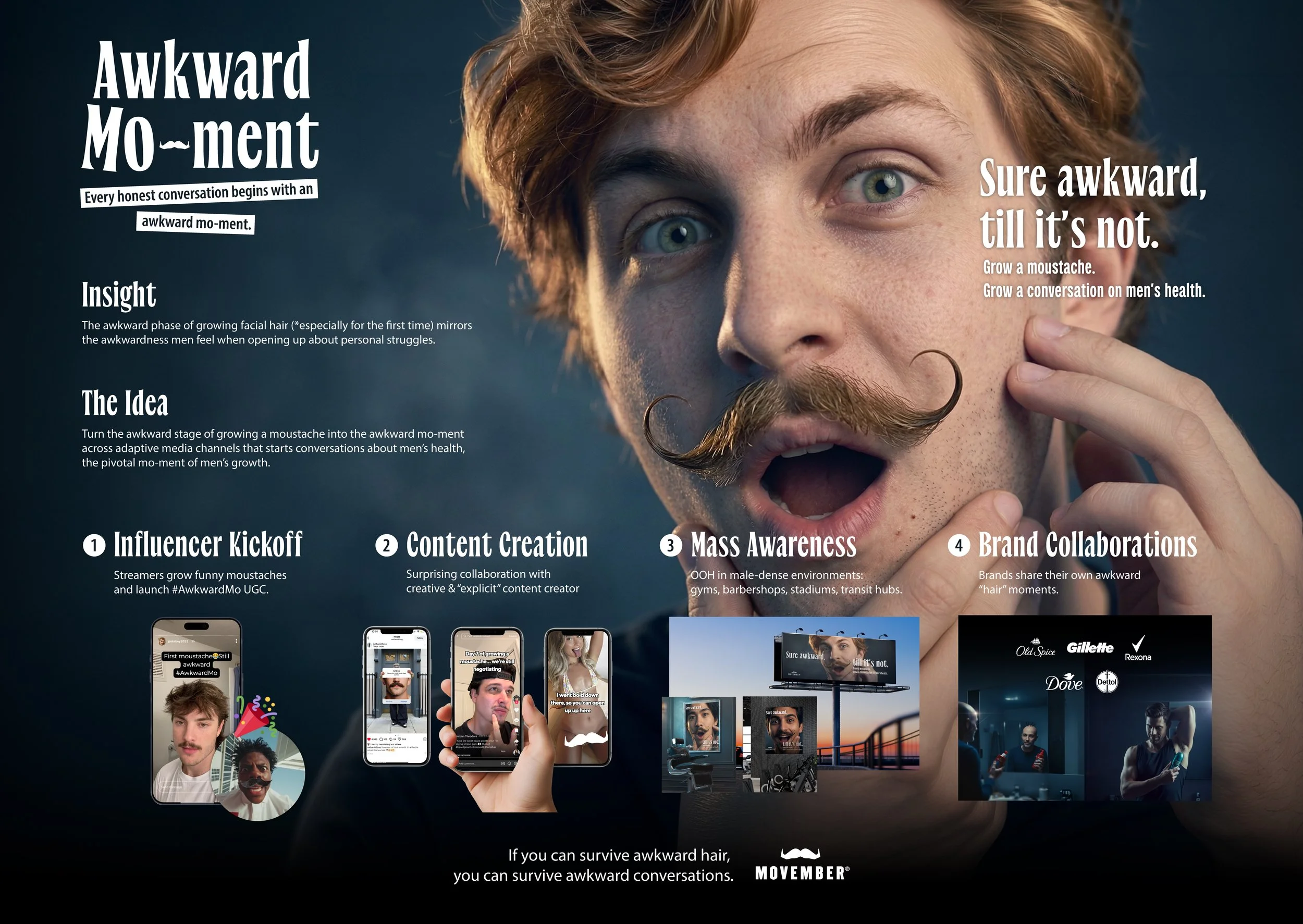 The Awkward Moment reframes the struggle of growing a patchy first moustache as a metaphor for the discomfort men feel when discussing their health. By celebrating the struggle stache, we prove that if you can survive awkward hair, you can survive an honest conversation. The movement ignites with IShowSpeed and Kai Cenat hosting an AwkwardMo challenge, followed by bold private hair stunts on adult platforms to break the ultimate taboos. From barbershops to stadiums, this campaign turns physical awkwardness into a badge of courage, proving that vulnerability, much like a first moustache, is just a natural part of growth.
